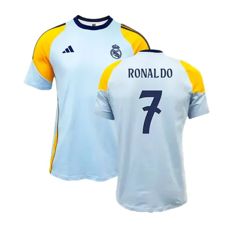 Official Cristiano Ronaldo football shirt. This is the NEW Real Madrid Training Tee (Glow Blue) for the 2024-2025 season which is manufactured by Adidas and is available in all Adult sizes.