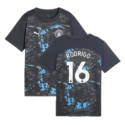 Official Rodri football shirt. This is the NEW Man City Prematch SS Jersey (Strong Gray) - Kids for the 2024-2025 season which is manufactured by Puma and is available in all Childrens sizes.