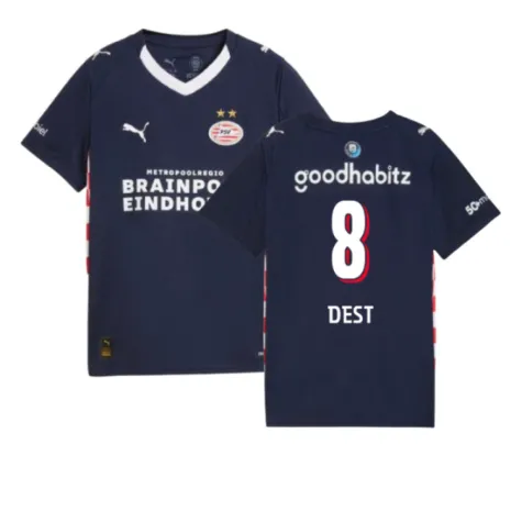 Official Sergino Dest football shirt. This is the NEW PSV Eindhoven Away Shirt (Kids) for the 2025-2026 season which is manufactured by Puma and is available in all Childrens sizes.