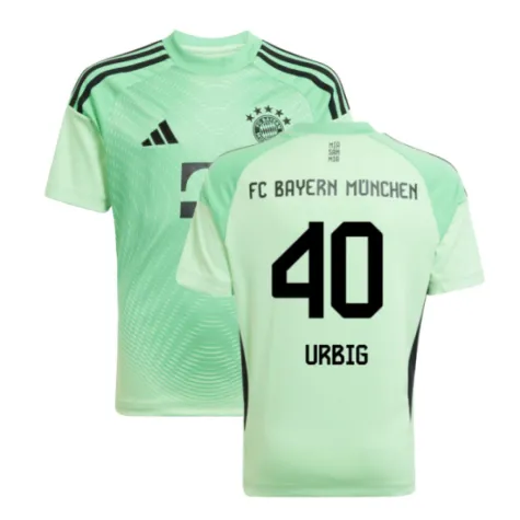 Official Jonas Urbig football shirt. This is the NEW Bayern Munich Home Goalkeeper Shirt (Glory Mint) - Kids for the 2025-2026 season which is manufactured by Adidas and is available in all Childrens sizes.